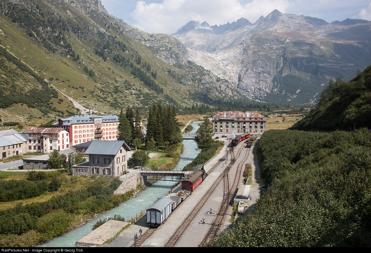Crossing of two trains of the Dampfbahn Furka Bergstrecke (DFB) in Gletsch. On track 1 HG 2/3 # 6 with a mixed passenger/freight. HG 3/4 # 4 is entering the station with a passenger train from the Furka pass.