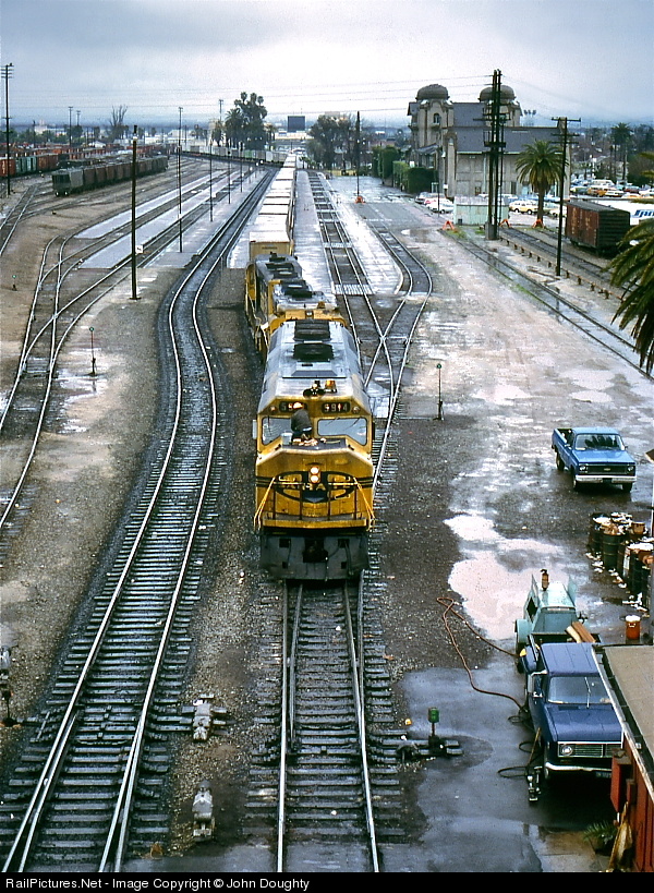 The crew of Santa Fe 5914 waits patiently in front of the San Bernardino passenger depot as a diesel shop crewman works on the windshield. This is the San Bernardino B yard, taken from the Mt. Vernon overpass.