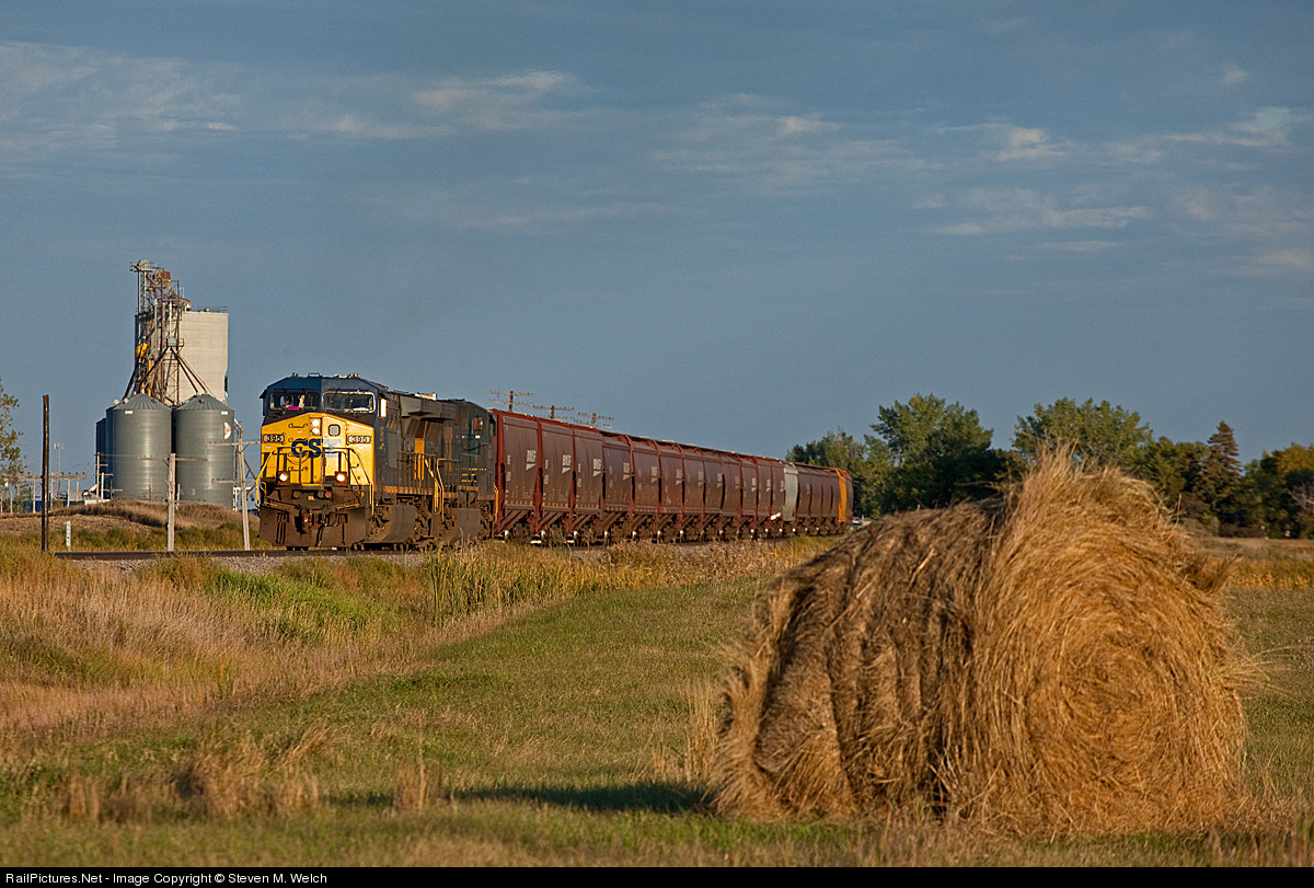 | Behind a pair of CSX GE's, a Bisbee grain load has crested Broken Bow hill and is back up to track speed, rolling through the farmlands of Eastern North Dakota. |