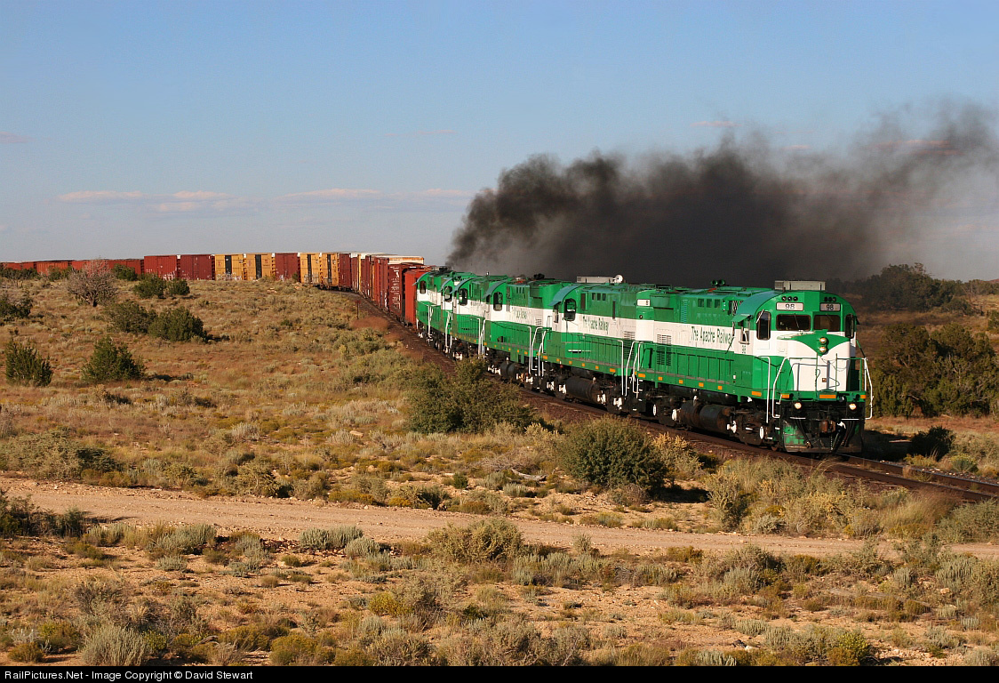 | The Apache Railways's Holbrook turn is on it's way back south with 41 cars after nearly a three hour work window at the BNSF interchange. In this view the train has already set out three cars at the Pig Farm. The crew with their immaculate set of Alcos will continue on to Snowflake Jct where they will make a brief stop to pick up 29 frac sand cars before continuing on to the carrier's yard and the Catalyst Paper Mill. The Holbrook turn job handled a total car count of 115 on this day, Not bad for a railroad with a uncertain future. |