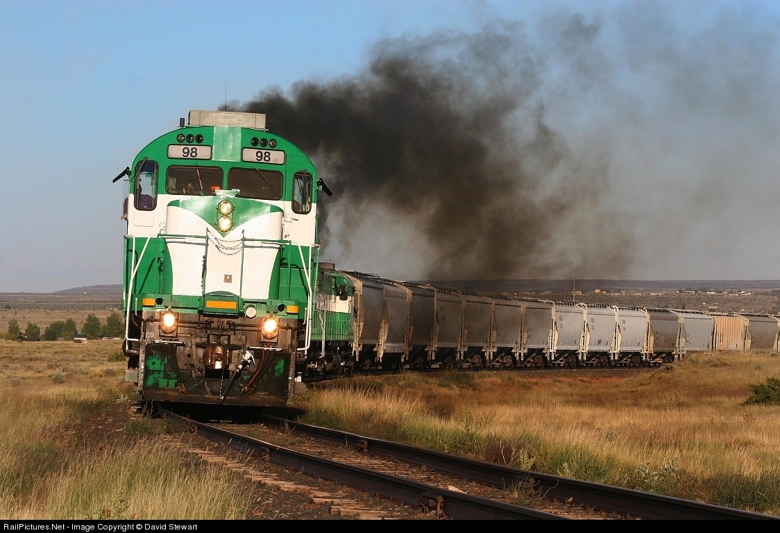 | The Apache Railway's Holbrook turn made a brief stop at Snowflake Jct to pick up 29 frac sand cars from the Snowflake Spur on it's return trip. After making the pickup, the engineer eases his immaculate Alcos into the late afternoon sun. |