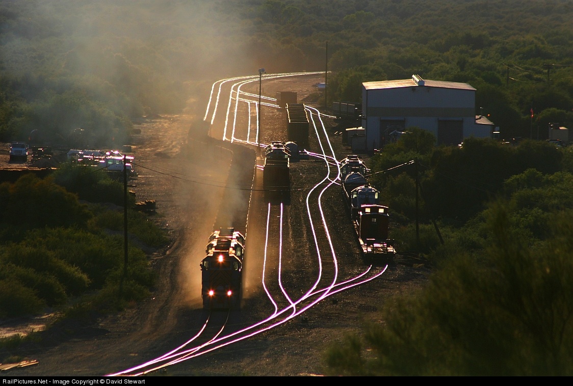 | Just a little before sunset, the last east bound Mine Run in day light hours is working hard through Hayden Junction while passing the carriers shop and office complex. The 2,300hp 12 cylinder turbo charged EMDs can be heard in run 8 for as long as one would want to stay and listen as they work the grade towards the Dumper. |