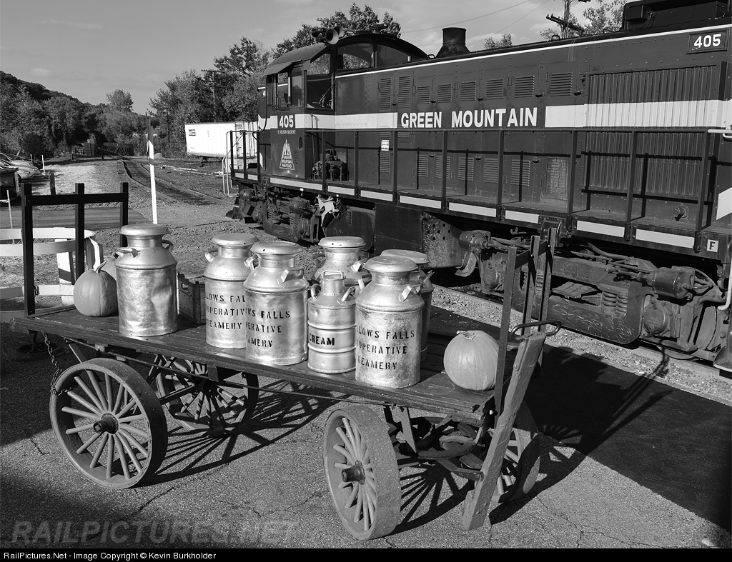 Green Mountain Railroad's White River Flyer is ready to roll at White River Junction, Vermont, with the milk cans and railway express wagon decorating the station platform. The venerable ex-Rutland Alco RS-1 405 is no stranger to the milk cans in the foreground as the Rutland was a large milk-hauler in New England!