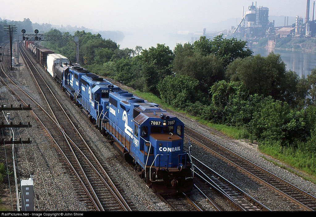 With a massive Steel mill looming out of the morning haze across the Ohio River in the background, Conrail GP38 #7887 is just entering Conway Yard.
