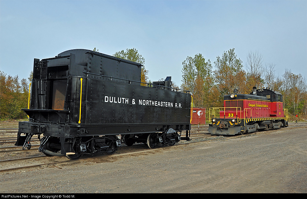 | The CTRR #33 moves back a little to let the D+NE #28 tender bask in the afternoon sun shining down on it. The tender is being lettered today as it almost completes a cosmetic restoration by the staff at the CTRR. The accompaning steam locomotive has a ways to go yet before being complete and ready for the public to view at the Depot in downtown Duluth, MN. |