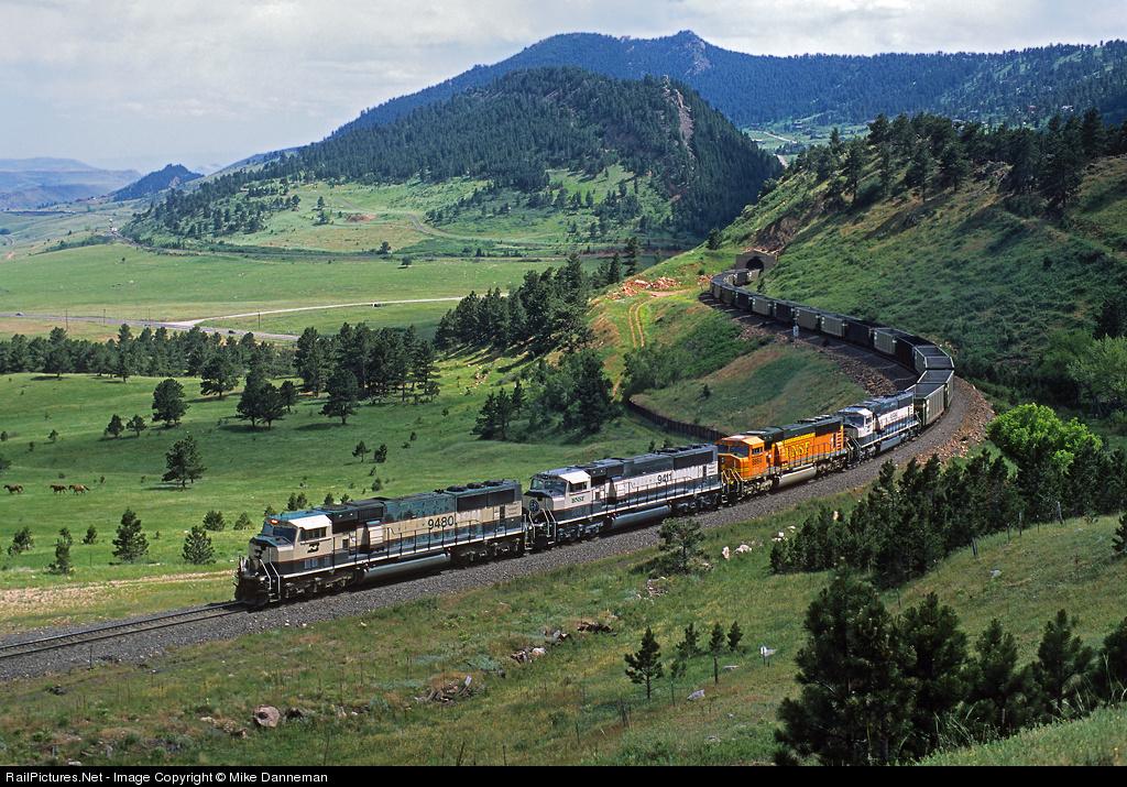 On June 16, 2001, a quartet of BN/BNSF SD70MACs leads an empty coal train out of Tunnel 1 just east of Plainview, Colorado. In conjunction with Utah Railway, BNSF operates occasional coal trains from Utah via the former Rio Grande route through the Rockies.
