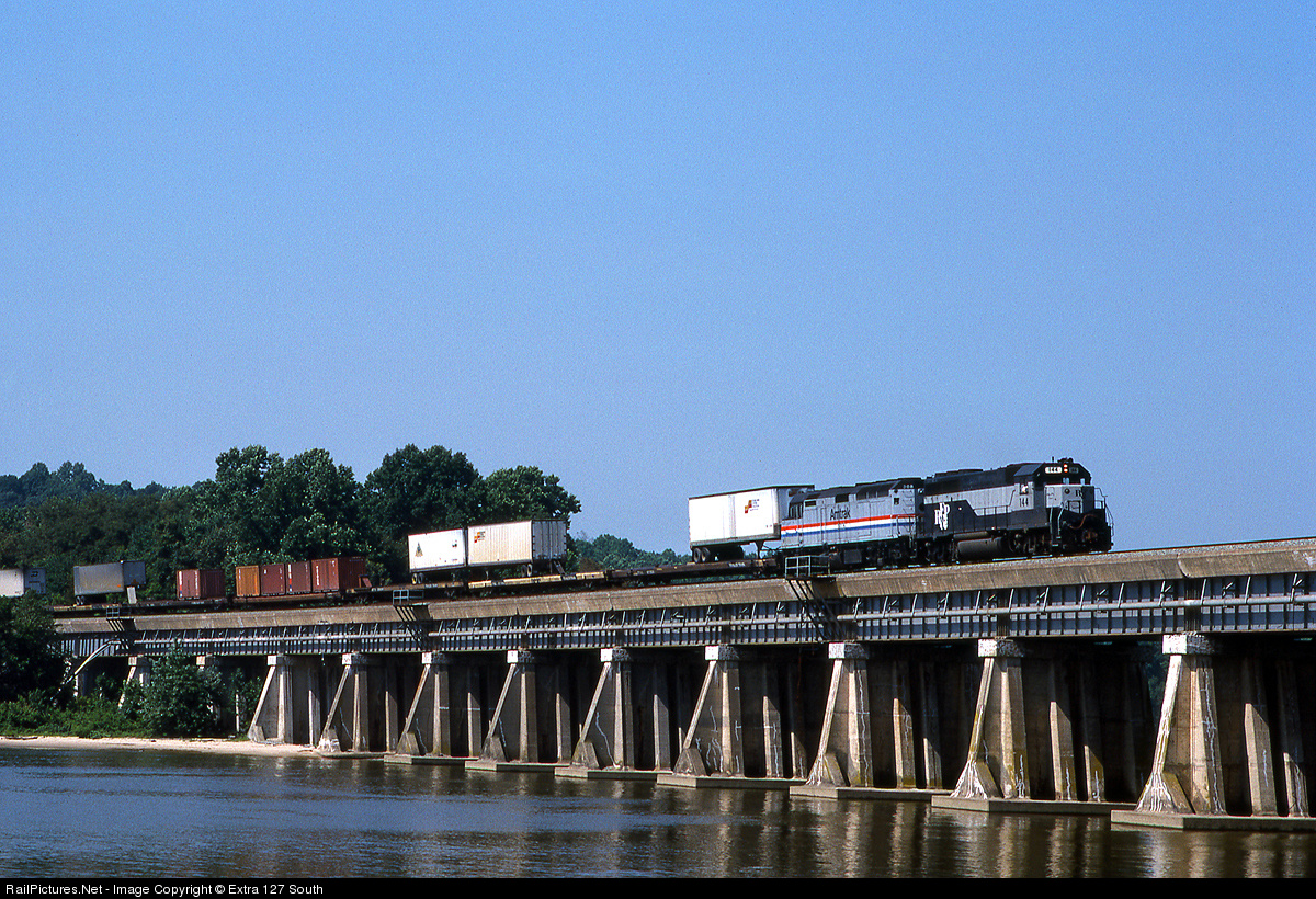 Northbound RF&P TOFC train No. 176 was crossing Powells Creek, near Neabsco, VA on June 29, 1989 with GP40-2 No. 144 and Amtrak F40PH No. 308. The 308 had been in a crossing accident south of Richmond on CSX and the HEP connections had been damaged. It was necessary to move the unit in freight service back to Washington. HEP isn't necessary to move TOFC trailers, so it was put to work earning its keep.