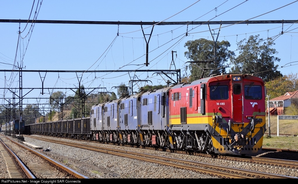 At the time this photo was taken, 18-690 was the newest 18E to arrive in Durban from Koedespoort, Pretoria. This could well be her first time out with a load, so fitting to see her as lead unit on what we know locally as the "Python" - 65 X CAR Wagons (Ore / Coal). A very late Shosholoza Meyl / Trans Natal can be seen to the left of the photo hopelessly trying to make up time to her final destination Durban, still about 1hr 45 minutes away,