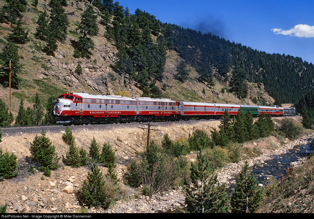 The so-called “Bill Gates Special,” a chartered Wisconsin and Southern passenger train with a few added cars for good measure, heads westbound just west of Rollins, Colorado, on September 25, 1998. Electro Motive Division E units operating on this former Rio Grande main line were rare; past history saw that mountain-climbing railroads of the west found EMD F unit more suitable for passenger trains on mountain grades. In less than a half hour, this train be taking the plunge in the 6.21-mile Moffat Tunnel.