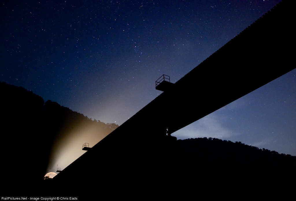 Paw Paw, WV 10/5/12 - Photography is about capturing light and its interaction with the subject that interests us. That is what captivates me about night photography, where the presence and absence of light work together to tell a story--this night of the stillness of the Kesslers Bridge over the Potomac River, quietly waiting for the next passing train. As Q-341 approaches, its headlight casts an eeire glow from within the mouth of Magnolia Tunnel. It is along the former B&O's famed "Magnolia Cutoff" which eliminated several miles of a twisting route along the river bank in favor of two high bridges and four tunnels that cut straight across the Potomac bends. Today it is part of CSX's Cumberland Subdivision between Brunswick and Cumberland, MD, and is the site of massive tunnel reconstruction that will soon allow for double stack trains.