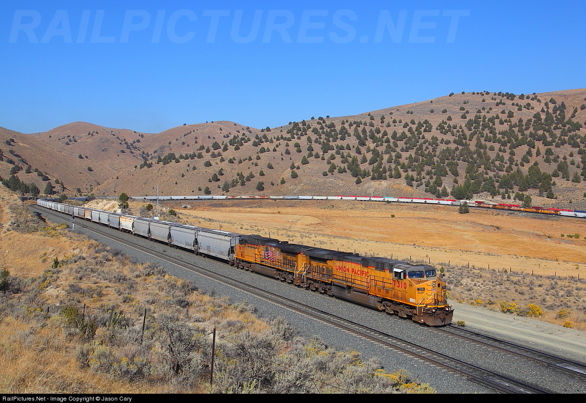 The east slope of Encina Hill, also known as Hindman Hill is the final 2.2% grade out of the Snake River Valley. The heavy grade begins when the rails leave the course of the Burnt River and begin to follow Pritchard Creek up a shallow Box Canyon. The Rails makes a sharp horseshoe curve around the walls of the canyon. Here a Soda laden unit train heads up the 2.2%. 8 units muscle this train against gravity. note; the helpers on the far side of the curve, and the stack train making its way east....