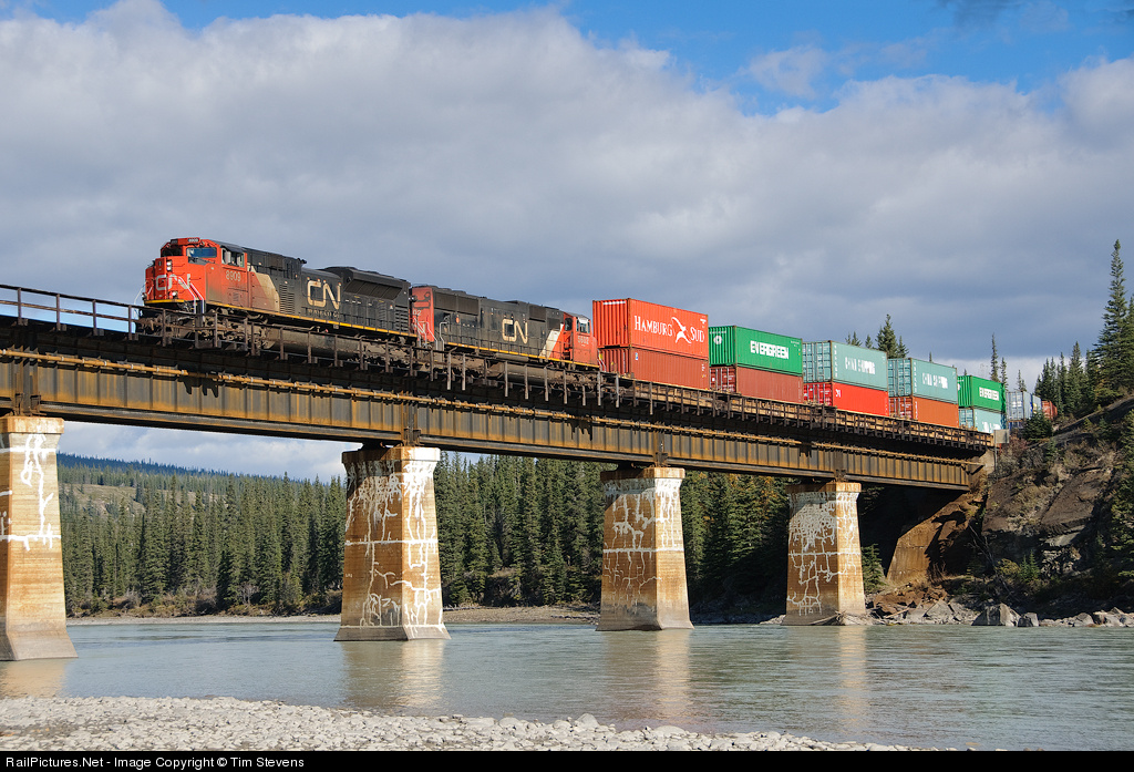 Winnipeg-Robert's Bank stacks cross the Athabasca River between Entrance and Solomon on CN's Edson Sub.