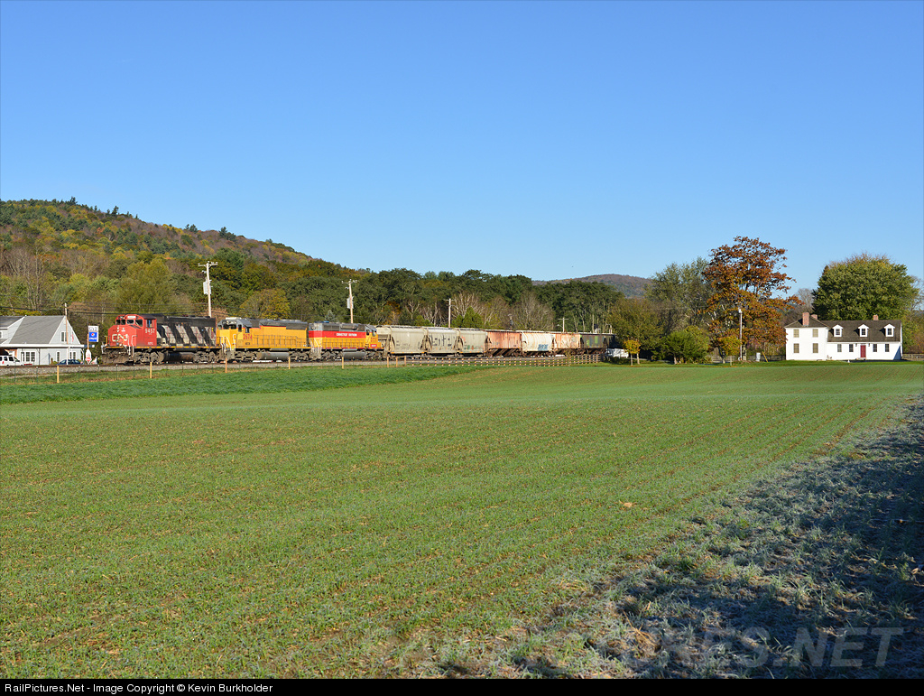 The New England Central Railroad train 324 is seen southbound on the approach to Windsor, Vermont, with an eclectic mix of RMPX GP40-2W 9457 still in CN attire, NECR SD40-2M 2674 and CSOR SD40-2 3771.
