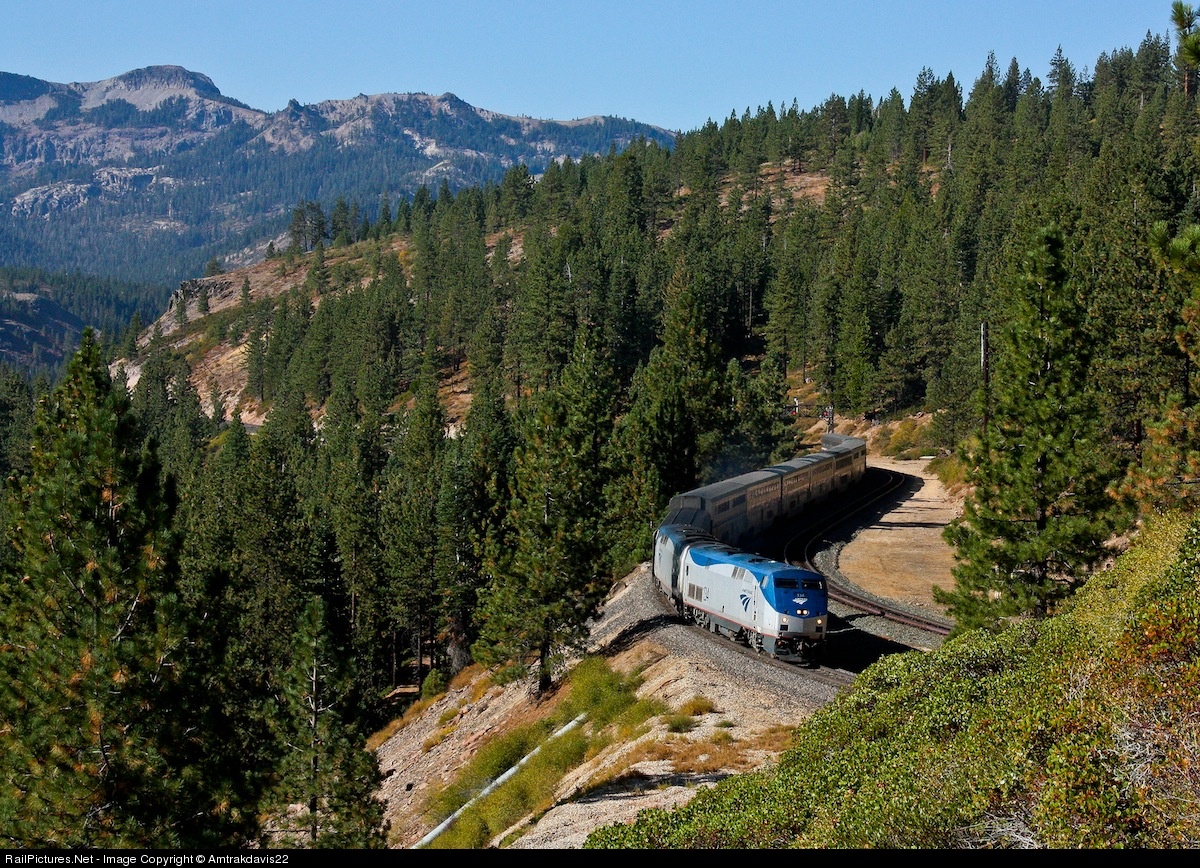 Amtrak will take you... Where no car or plane would dare take you. The passengers aboard the Amtrak's westbound California Zephyr wake up to the incredible mountain scenes of the Sierra Nevada's. For the next few hours, this train will wind it's way down the scenic and historic Donner Pass Route. Here the train is scene coming through Andover, CA (West Truckee). This train would end up leading UP 844 down the hill.