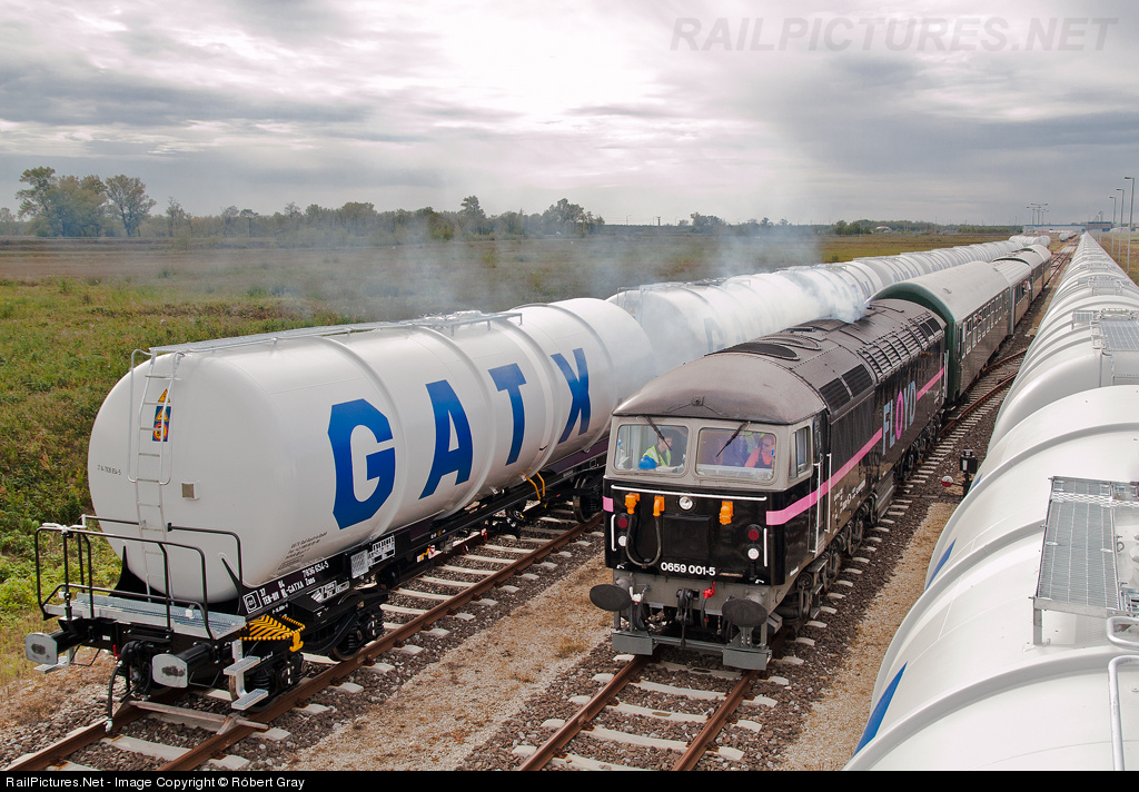 | British railfan's "Pre-Emptive Strike" photo charter train in Hungary. Mercia Charters Limited organised a railtour with the ex-British Railways Class 56 #56101 locomotive, which is now owned by Floyd (a hungarian private freight operator). The train went along many main and branch lines in western hungary, and also visited the service track of the port of Gönyű. The storage tracks were full of brand new non-used GATX tank cars, which were a giving a great elevation to take this photo. |
