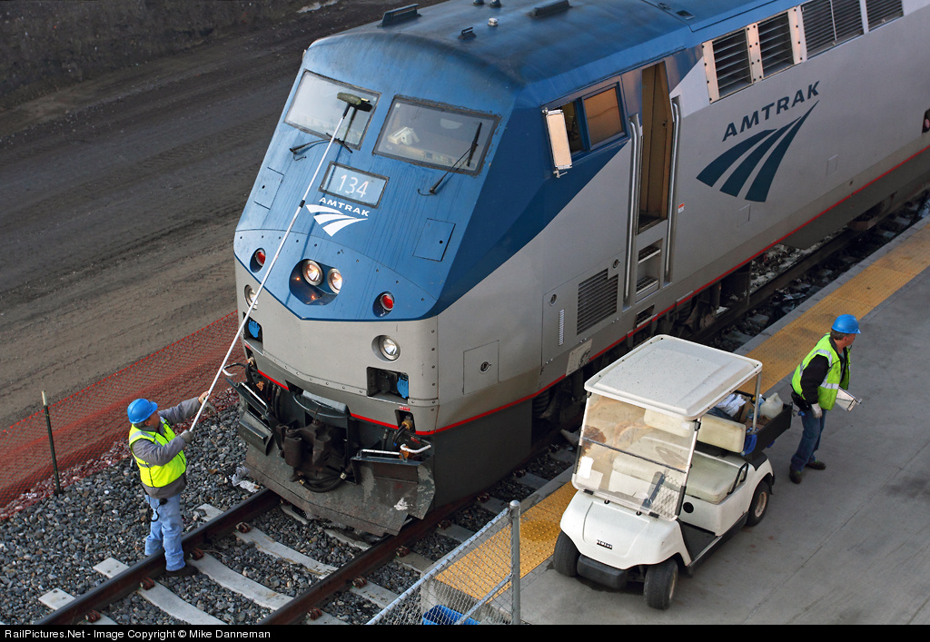 Amtrak No. 5, the California Zephyr, gets serviced during the station stop at Denver, Colorado, on October 14, 2012. This included getting the front windows washed on P42DC No. 134. Denver Union Station is being renovated as part of a major reconstruction of the real estate in this part of LoDo (Lower Downtown) Denver and this temporary depot across from Coors Field is presently being used.