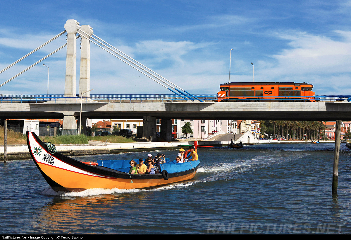 Alsthom 1901 crosses the bridge over "Ria de Aveiro". In this picture we can see also a "Saleiro"(Saltboat), a vessel that was formerly used to transport salt in this region but is now only used for tours.