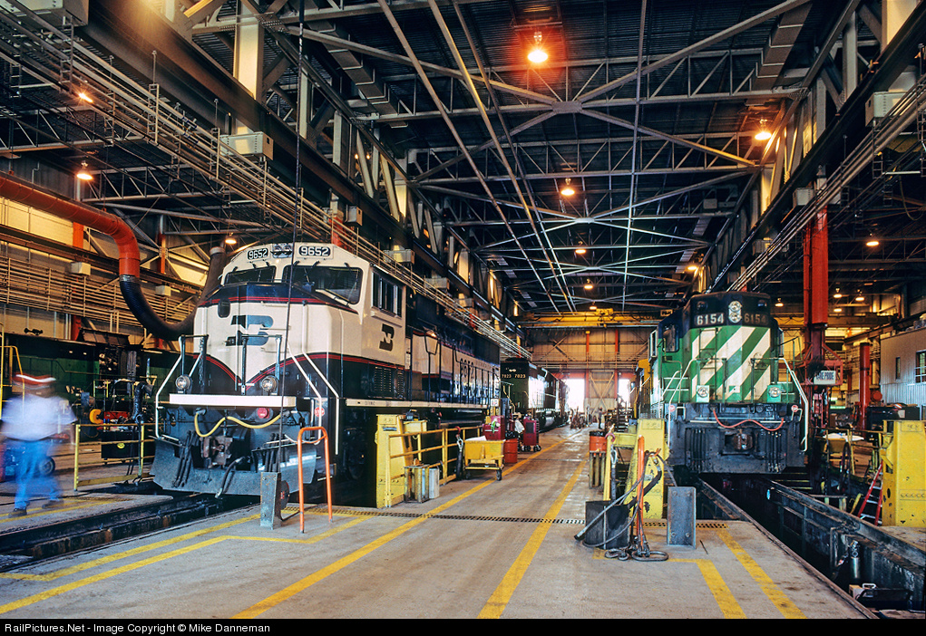Burlington Northern SD70MAC No. 9652 receives some maintenance and shares shop space with veteran BN SD9 No. 6154 at Alliance Shops in Nebraska on June 13, 1998.
