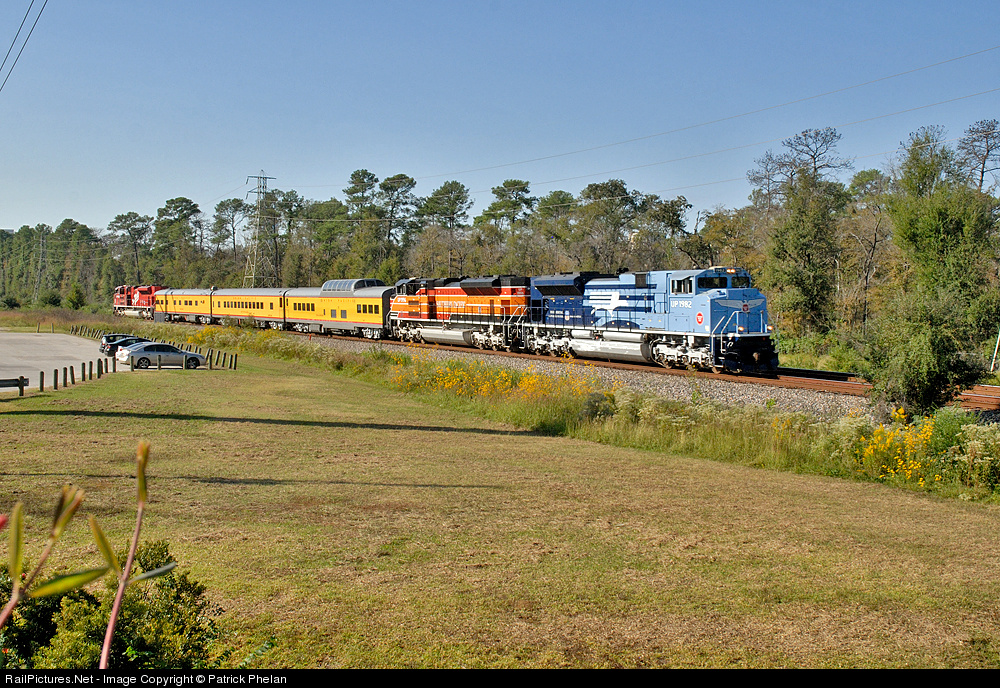 | Half of UP's heritage fleet pulls a short passenger special for the Boy Scouts on Houston, TX area terminal trackage. Beautiful weather and ample sunshine made the day even better. |