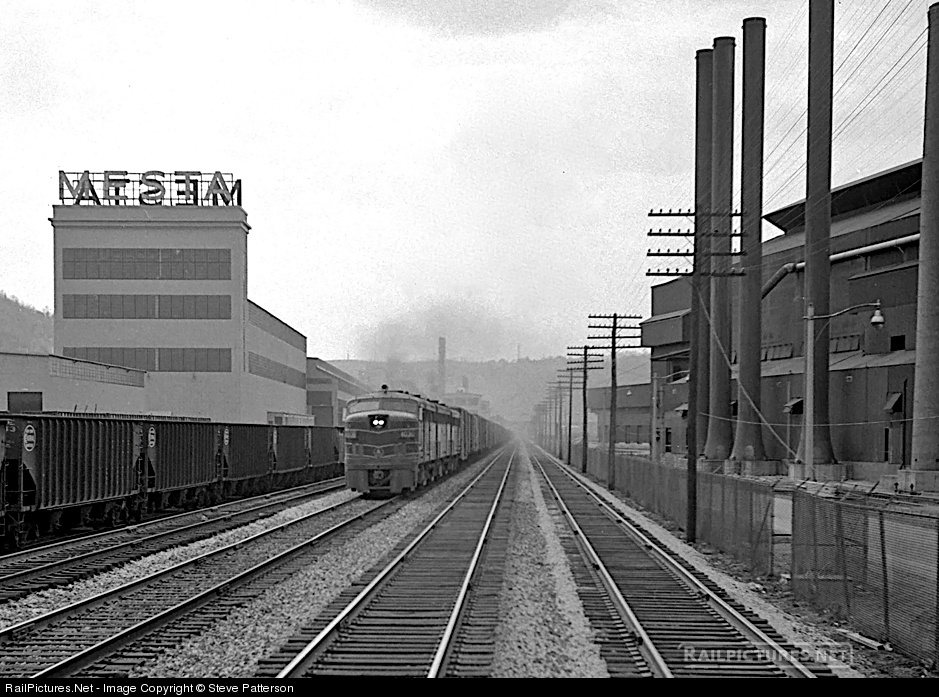 | Three B&O Alco FA-2 units (No. 4030 on the point) have eastbound tonnage rolling on the Pittsburgh & Lake Erie RR by trackage rights, passing Mesta Machine Works. |