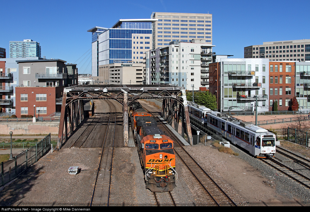 At 3:37 p.m. on October 21, 2012, a BNSF coal train heads south on the Joint Line over Cherry Creek at Denver, Colorado. Racing the coal train and passing it at speed under Speer Boulevard Bridge is a RTD (Regional Transportation District) light rail train.
