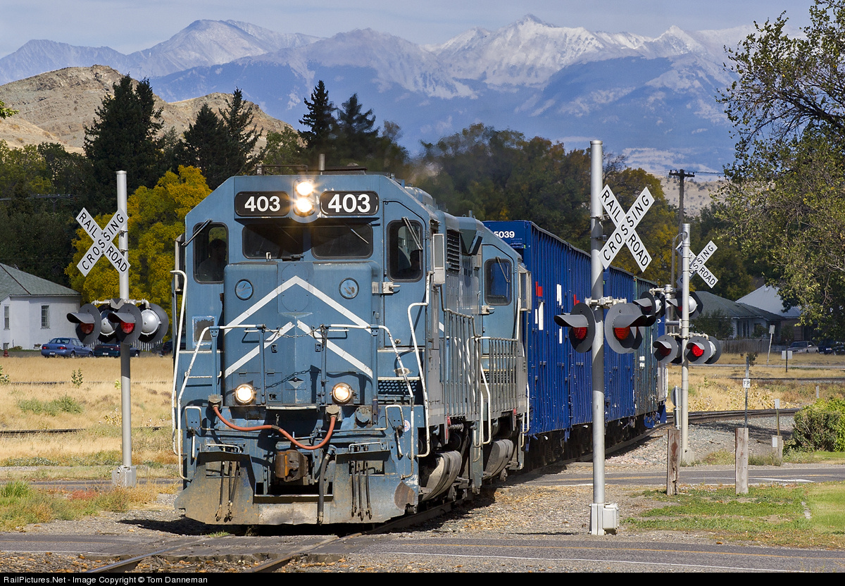 A pair of Montana Rail Link GP35s heads off of the main line in Livingston, Montana, and on the old branch which once went to Gardiner and the north entrance to Yellowstone National Park. The two former Rio Grande/Omnitrax GP35s are taking four wood chip cars and a caboose (for the return back-up move) to a lumber company just south of here where the spur ends.