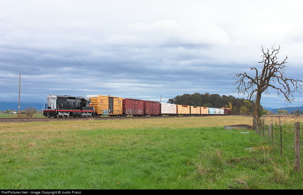 Under a typical Pacific Northwest sky, the Albany and Eastern local makes its way west toward Albany and the Portland and Western interchange. On this day, Oct. 15, 2012, Southern Pacific SD9 5399 has the honors of leading the train. The combination of a vintage EMD and a scenic branch line, made the cloudy weather a little easier to deal with.