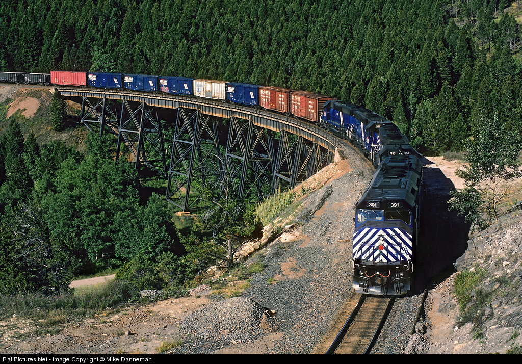 Montana Rail Link’s Missoula-Laurel freight (ML) crossing Austin Creek Trestle (also know as Skyline Trestle) on Mullan Pass, Montana, on August 9, 1996. On the point is No. 391, one of MRL’s cowl F45s.
