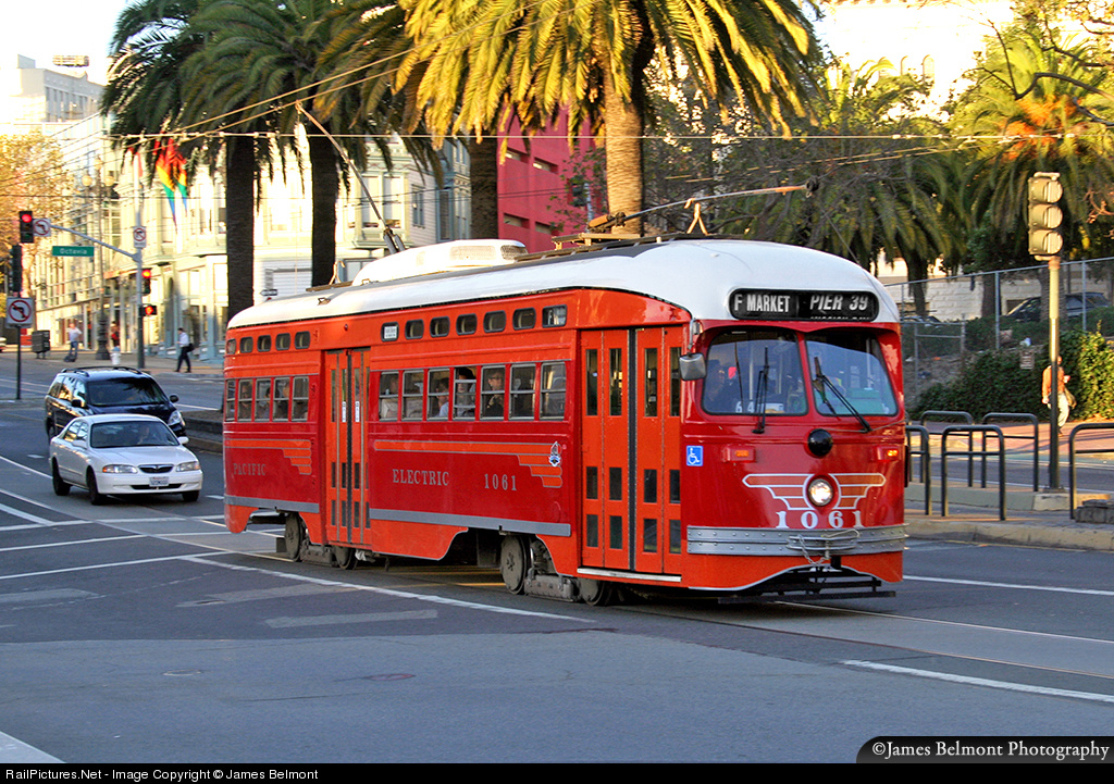 MUNI car 1061 heads south at sunrise on Market Street in San Francisco. This PCC streetcar, built by St. Louis Car Co. in 1948, is painted in the red, orange, and silver livery of the Pacific Electric, inspired by the ‘Daylight’ colors of PE’s big brother the Southern Pacific Railroad.