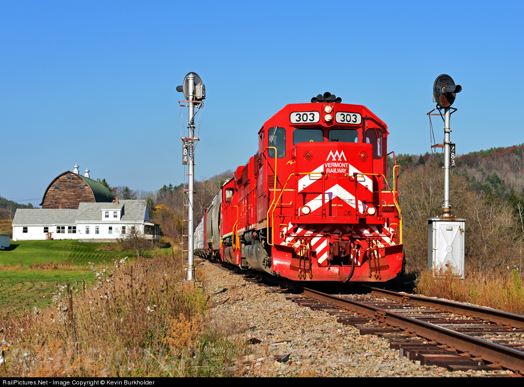 On the final day of matched Vermont Railway power on the Washington County's Connecticut River Division, train NPWJ is enroute from Newport to White River Junction, Vermont behind GP40-2 303 and GP40-2 307. The 303 will be swapped out for CLP GP40-2 306 upon arrival in White River, ending a week-long pairing of Vermont Railway units for Conn River Division. Heading south along the right Northeast Kingdom farmland, the NPWJ charges through long deactivated Canadian Pacific signals.