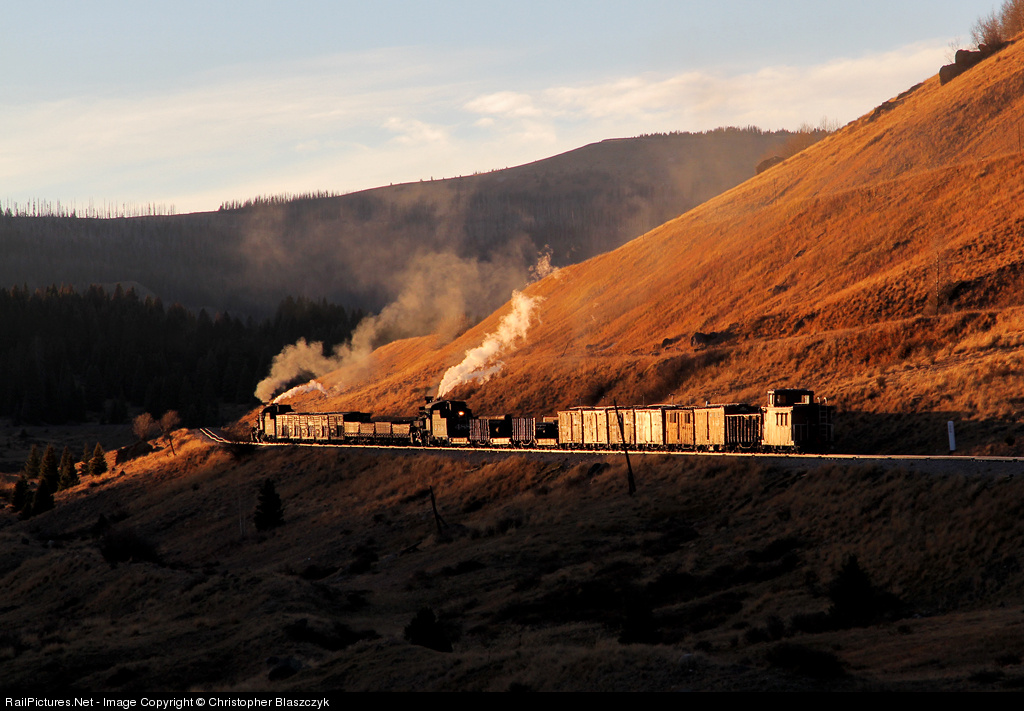 328 miles from Denver, a westbound road freight, led by D&RGW 2-8-2 487 and assisted by mid-train helper 488, has just left the Los Pinos valley and continues the climb up to Cumbres Pass, being chased by the encroaching shadows of sunset. A FarRail Tours/Lerro Productions photo charter.