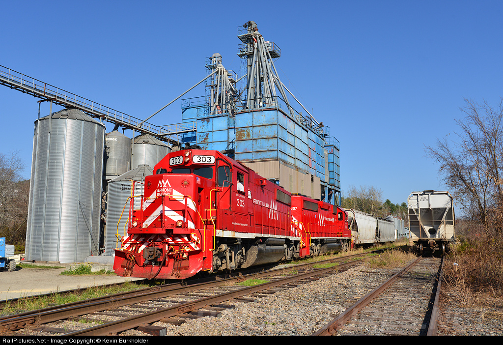 On the final day of matched Vermont Railway power on the Washington County's Connecticut River Division, train NPWJ is enroute from Newport to White River Junction, Vermont behind GP40-2 303 and GP40-2 307. The 303 will be swapped out for CLP GP40-2 306 upon arrival in White River, ending a week-long pairing of Vermont Railway units for Conn River Division. One of the larger customers on the line, Morrison's Custom Feeds of East Barnet, is serviced on the southbound trip.