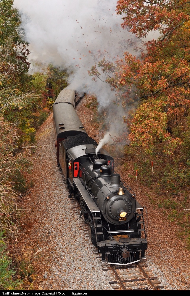 | 630 leads one of this year’s annual TVRM fall leaf trips from Chattanooga, TN to Summerville, GA. Note the leaves being blasted skyward by the engine’s exhaust as it works uphill. |
