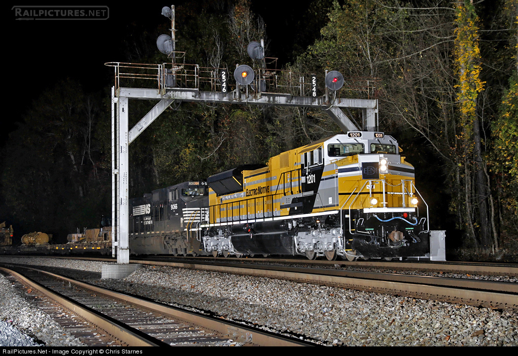 | EMD/CAT's brand new SD70ACe #1201 leads NS high & wide train 055 southbound under the signal bridge at Tunnel 25 in Oakdale, TN on a mild October evening. The 1201 had been debuted at the Mine Expo in Las Vegas in late September and was later a center attraction at the Caterpillar Museum Grand Opening in Peoria, IL before being placed into revenue demonstrator service with NS. Train 055 is enroute to Savannah, GA with several flatcar loads of CAT dozers and other equipment to be loaded onto ships for export. |