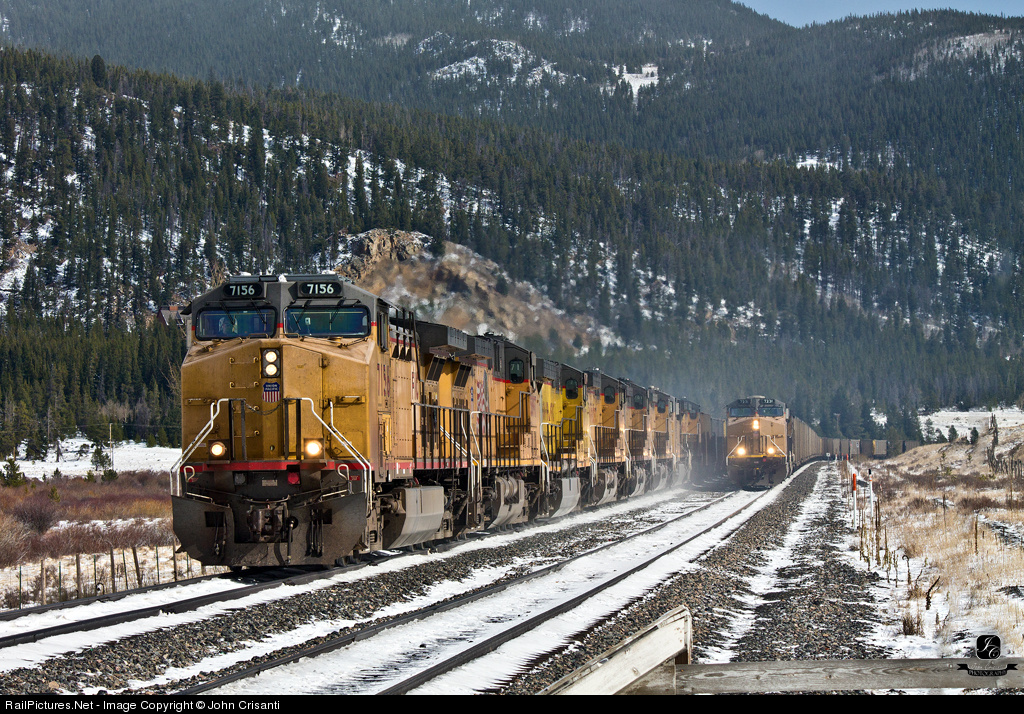 At Tolland, the coal empty on the right parked in the siding experienced locomotive problems and is in need of a couple of extra units. Luckily, another coal empty following behind had several units, seen on the left, in tow to spare the train with.