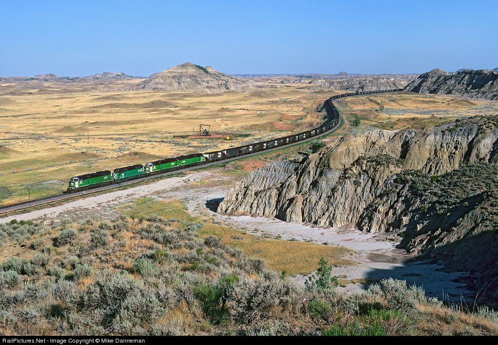 An eastbound Burlington Northern coal train grinds through the āsā curve at milepost 143 just west of Sully Springs, North Dakota, on the morning of August 10, 1991. Three new SD60Ms bracket an older SD40-2 on this train passing through the scenic Badlands.