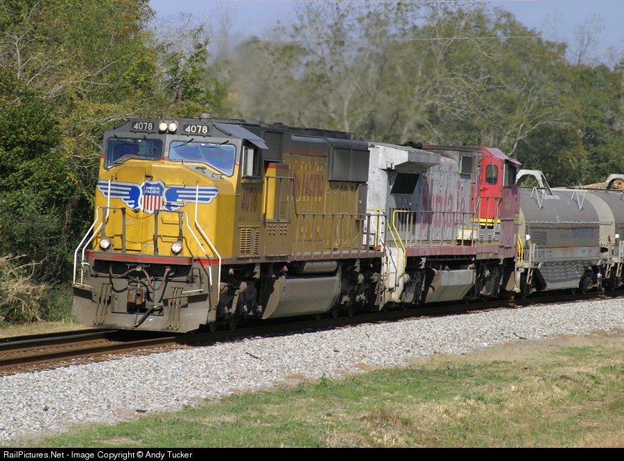 | UP 4078 and ATSF 561 (1 of 4 remaining B40-8W's that BNSF has not "touched up") lead NS train 393 towards New Orleans, LA. |