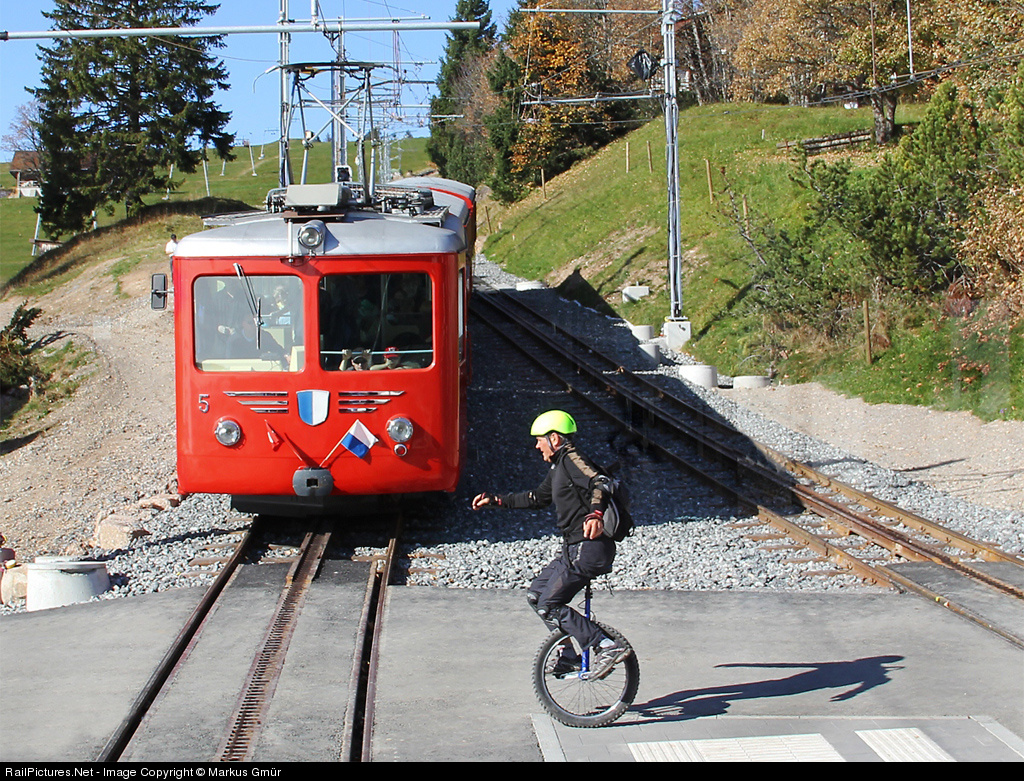 No, it's not dangerous! During the train is waiting for the continuation of one's journey in the station Rigi Kaltbad First (the track is occupied of another railcar), a man on a unicycle crosses the tracks