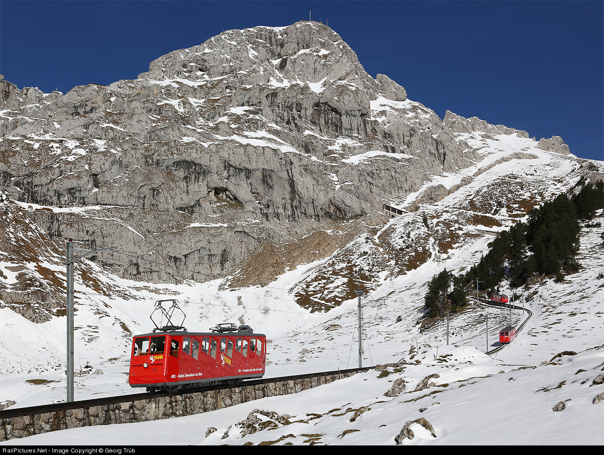 Electric cogwheel railcar Bhe 1/2 # 25, 27 and 23 (all built by SLM and MFO in 1937) on the Mattalp. The continuation of the route goes from right to left through the Eselwand (donkey wall) with a pitch of up to 48 %. The donkey is one of the summit of Mount Pilatus mountain range. The world's steepest cogwheel railway was inaugurated in 1889 and goes from Alpnachstad (440 meter a.s.l.) to the Pilatus mountain (2073 meter a.s.l.). The gauge is 800 mm and the Locher cogwheel system is unique. Because the railway is not running in wintertime from mid november till may, a picture with so much snow is very unusual!