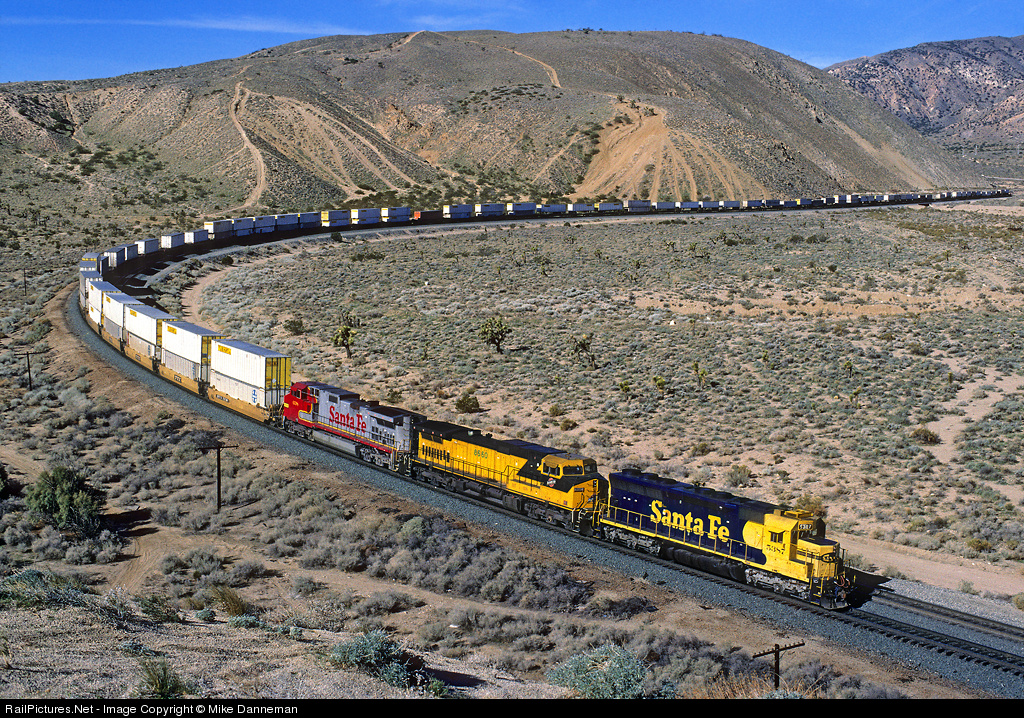 An eastbound intermodal train drops downgrade on Tehachapi Pass at Warren Curve near Mojave, California, on March 8, 1996. Leading the train is venerable Santa Fe EMD SD45 No. 5387, along with a pair of colorful GE C44-9Ws; a far-from-home Chicago and North Western “lightning stripe” No. 8660 and a home-road Superfleet Warbonnet No. 638.