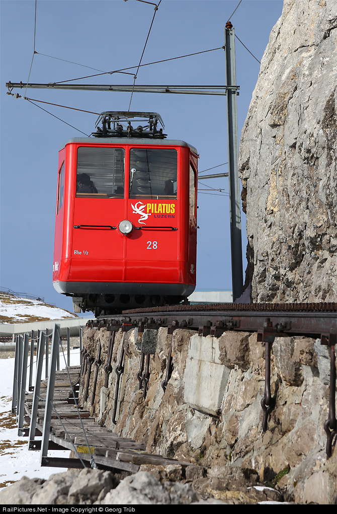 Cogwheel railcar Bhe 1/2 # 28, built in 1937 by SLM and MFO and thanks to good maintenance in excellent condition, little below the top station Pilatus Kulm. Here clearly visible the trackbed made from stones, rails and cograil still from the opening year of the railway in 1889, firmly fixed with anchors that pass underneath. The wheels of the railcars have outwardly disposed flanges. The horizontally arranged cogwheels engage from both sides in the "Locher" cog system.