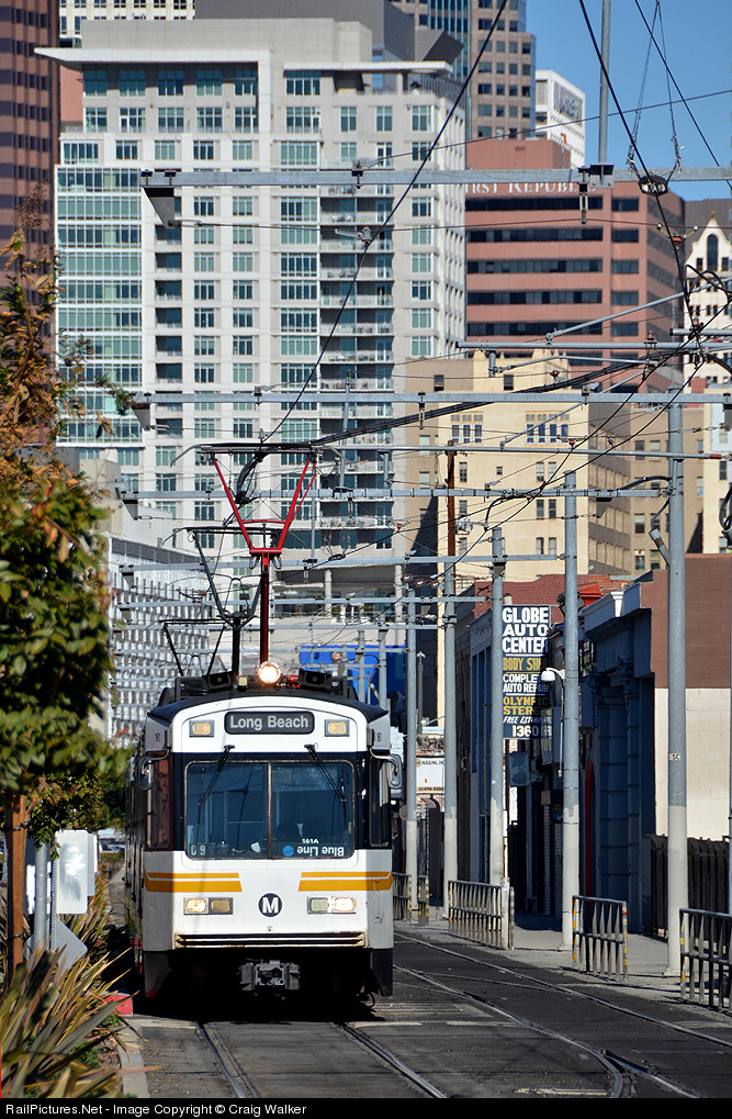 Los Angeles MTA P865 161 (built by Sumitomo/Nippon Sharyo in 1994) heads down Flower Street, southbound out of Los Angeles on the oldest of the MTA's light rail lines, the Blue Line (from downtown L.A. to downtown Long Beach). The downtown section of this line is now also the eastern end of the MTA's newest line, the Expo Line (operating between downtown L.A. and Culver City). Slowly, but surely, rail transit is making a comeback in heavily congested Los Angeles!