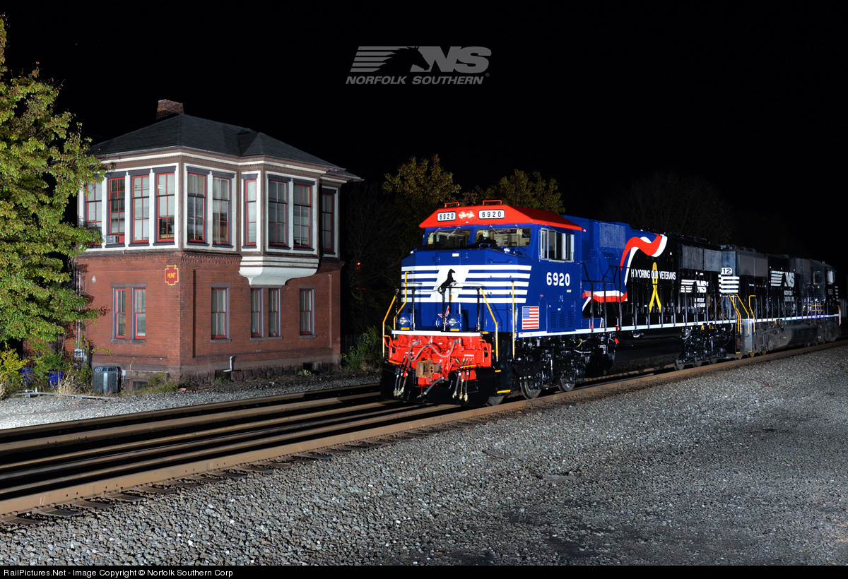 | Norfolk Southern SD60E number 6920 has been painted in a special scheme in honor of our Nations' Veterans and members of all branches of the Armed Services. It is seen here passing Hunt Tower in Huntington, PA, during its positioning move from Altoona to Harrisburg to be placed into revenue service. Photo by Casey Thomason. For more information, visit www.nscorp.com |