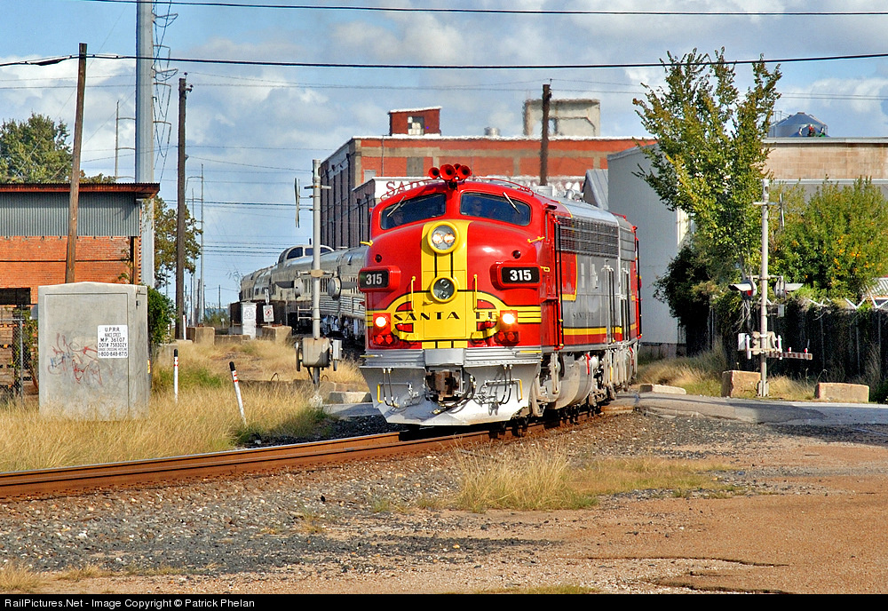 | The Santa Fe F's shove their train eastbound on UP's passenger main from the Amtrak depot, approaching Tower 26 and their southbound turn toward Galveston. |