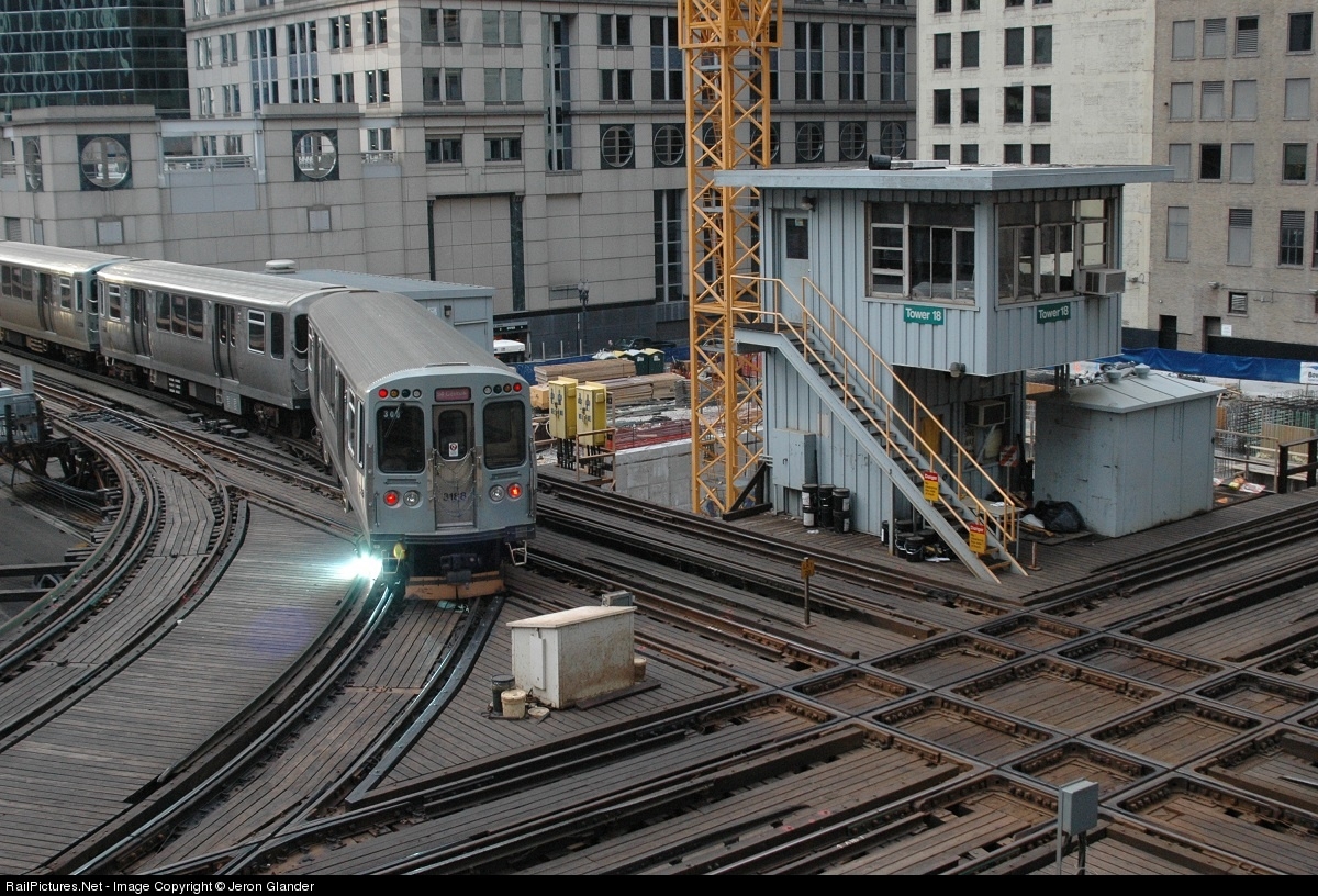 A third rail shoe arcs as a pink line train exits the loop bound for 54th/Cermak. Tower 18 has since been completely rebuilt with a more modern, streamlined look.