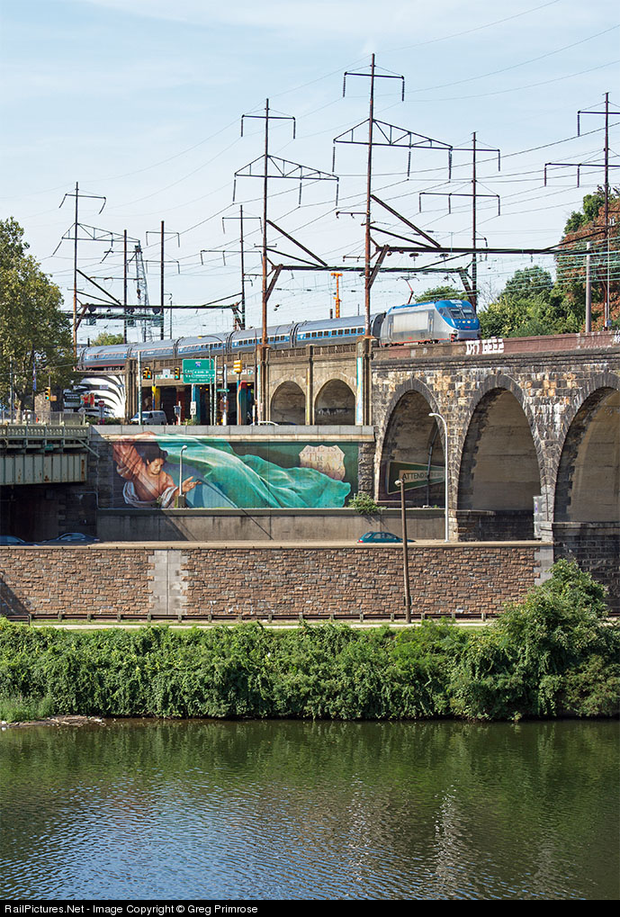 | One if by land, two if by sea, three if by rail. Amtrak's NEC crosses the Schykull River, West River Drive, I-76 and Girad Ave, all in one scene. |