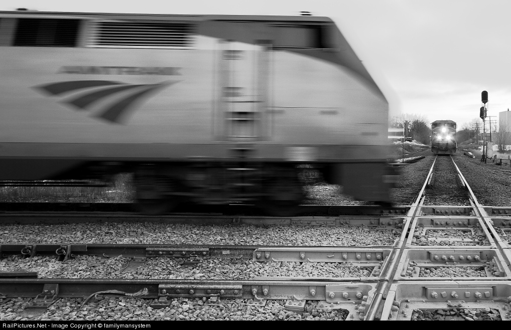 | Crossing Path's- GE's cross path's at the crossroads of Canada- Duplainville WI. Westbound Amtrak 7, on CP's Watertown Sub clatters across in front of a northbound CN manifest on their Waukesha Sub, on a gloomy winter afternoon. |