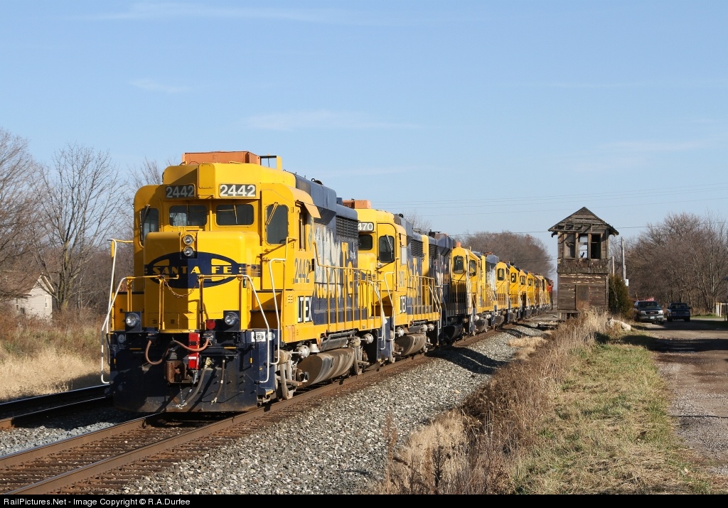 A going away photo of CSX train X791, eleven dead former BNSF GP-30u and GP-35 units destined for the LTEX facility near Lordstown, Ohio. The former B&O Nova tower still stands...barely!