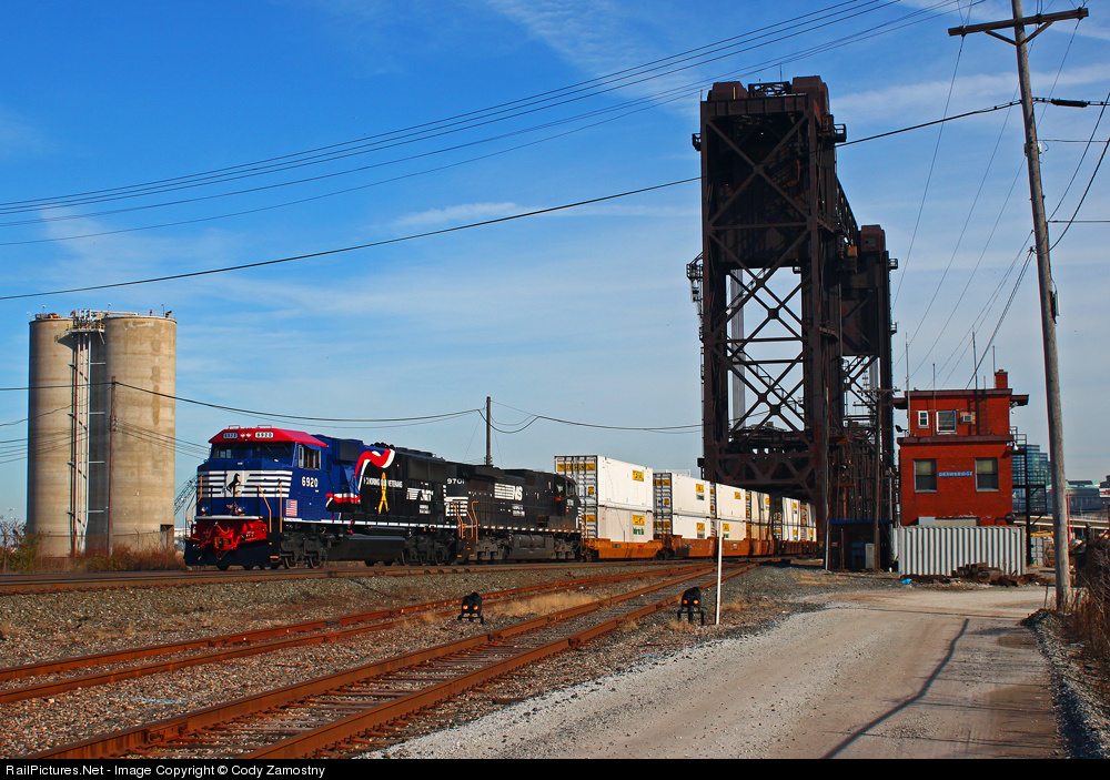 | Norfolk Southern recently released an SD60E locomotive decorated to pay tribute to the veterans who protect our country. Here, the 6920 leads intermodal train 21G across the Cleveland Drawbridge that spans the Cuyahoga River on the shore of Lake Erie. |