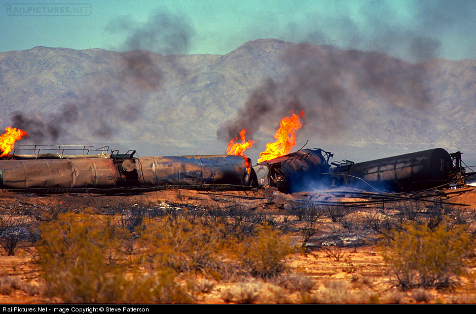 Every employee's nighmare --- derailed tank cars of LPG exploding and burning. When will it end? AT&SF derailment at Love, Ariz. on March 16, 1977, 65 miles east of Parker on the Parker District, now a shoreline operator.